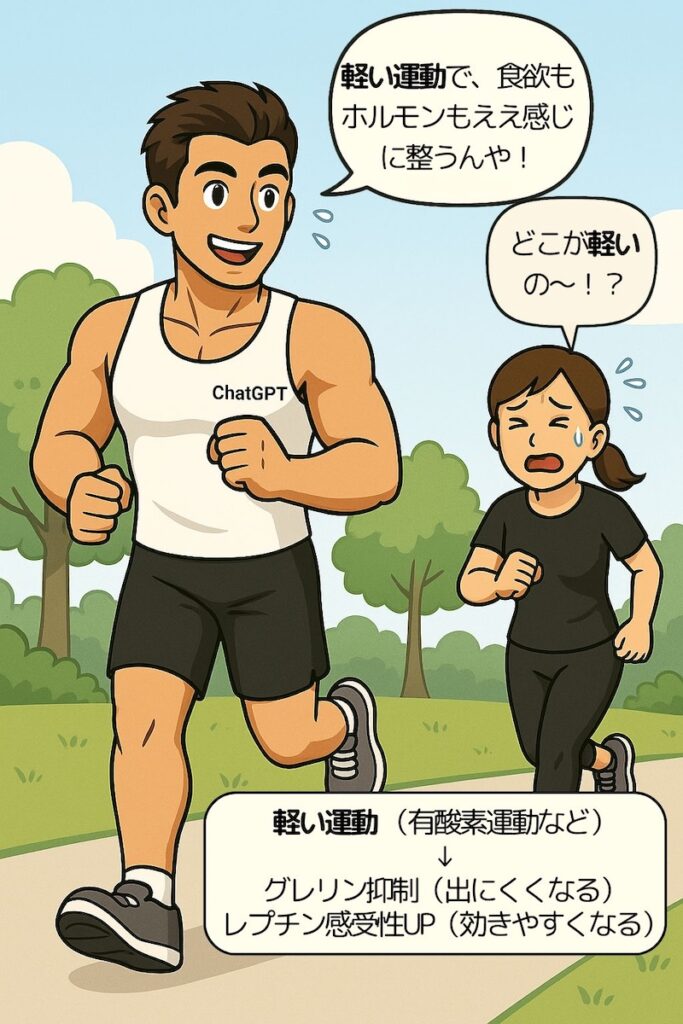 👉 軽い運動はグレリンを抑えるけど、やりすぎると糖の減りを補うために逆にグレリンが増えて食欲爆発することがあるそうなので、ご注意ください。