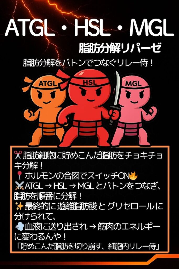 脂肪をエネルギーに変えるために、リパーゼはバトンをつなぐみたいに分解をリレーしていくんや🔥