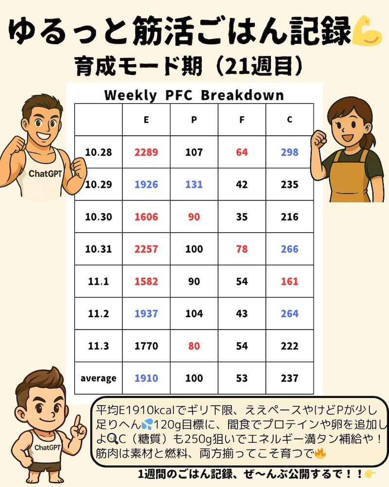 \ゆるっと筋活ごはん🍚 21週目!/リコンプ1ヶ月目💪 育成モード🔥10月28日~11月3日